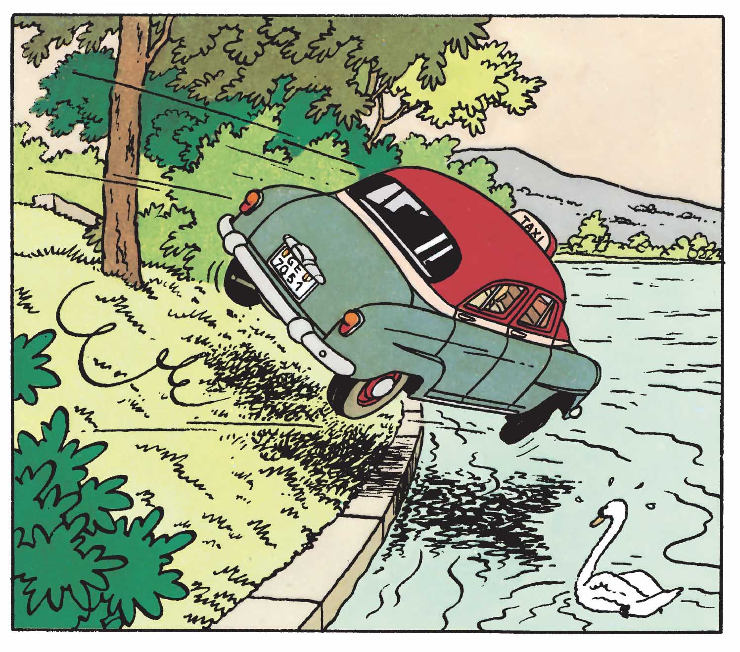 In this album, the thread of the story was sparked by a real news item spotted by Hergé in the Belgian weekly Le Face à Main. And then, there’s this scene. A car speeds past, cutting them off. The taxi carrying Tintin and Haddock skids, plunges into Lake Geneva. From that point on, everything falls into place: the lake, the quay, the car, the splash. The line becomes a witness. Hergé wanted to locate the exact spot where a car could realistically leave the road and sink into the lake.